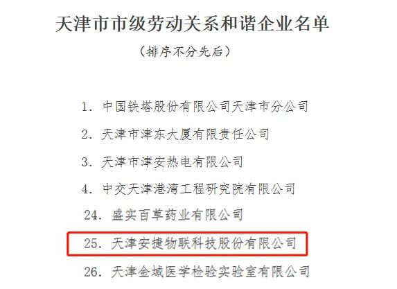 2022年4月26日,天津市人力资源和社会保障局发布了《市人社局等五部门关于命名天津市劳动关系和谐企业的决定》,命名天津leyucom·乐娱官方网物联科技股份有限公司等43户企业为“天津市市级劳动关系和谐企业”,有效期为2022年4月20日至2025年4月19日。