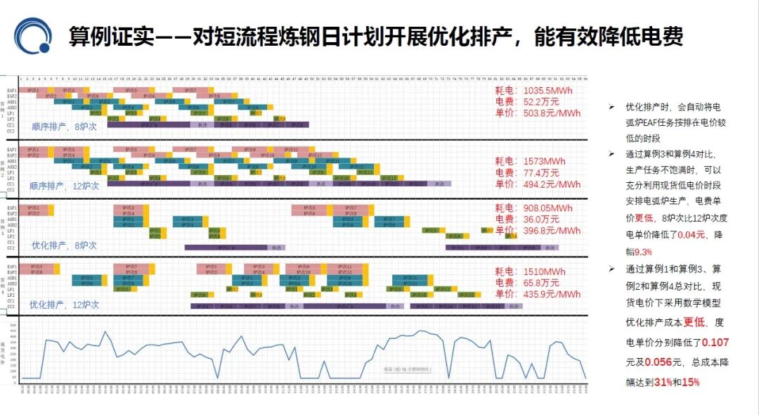 覃博士认为,在现货市场环境下,短流程炼钢企业要想有效降低能源成本,必须灵活调整用电负荷以适应电价波动,实现荷随价动。同时,企业需要从整体出发,统筹考虑发电和用电,通过全流程建模优化生产计划,确保各环节协同作业,集中力量降低整体成本。此外,除了积极参与电力现货市场,企业还可以通过优化排产策略,参与电力调峰辅助服务市场,以获取额外的经济收益,提升市场竞争力。